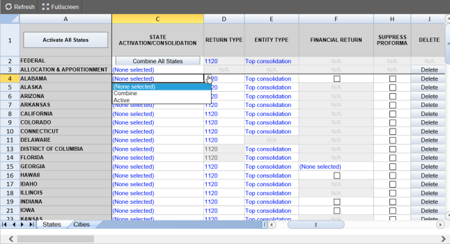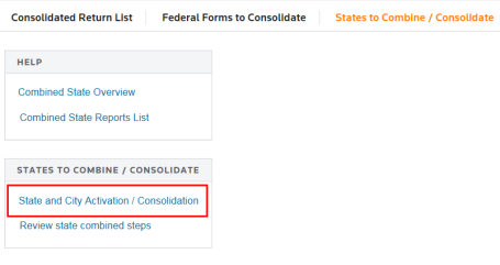 Click the States to Combine / Consolidate tab, and then click the State and City Activation/Consolidate link.