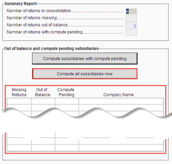 Once any out-of-balance locators have been corrected and recomputed, return to Step 4 - Review Preconsol Checklist > Out of balance and compute pending folder to verify changes. Click the Compute all subsidiaries now button again. The grid should now be blank and show no entries.