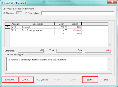 - The TRCs button lists all TRCs and their descriptions to create a journal entry using a TAXnnn account.