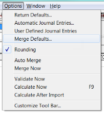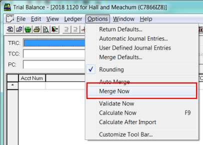 After you set merge defaults, you are ready to merge the bridged data. From the Trial Balance Grid menu bar, select Options > Merge Now. Bridge will merge the data in the bridge file into the tax application. If selected forms have not been specified, no tax forms will be updated. If selected forms have been specified, only the selected forms will be updated.