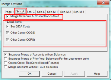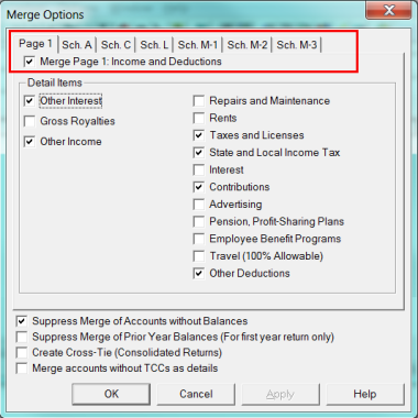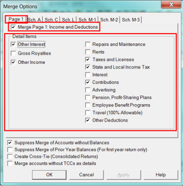 The Merge Option dialog box appears. Check all tabs to determine which forms and detail items will actually be merged. If the check box at the top of a tabbed page is checked, the entire form will be merged.