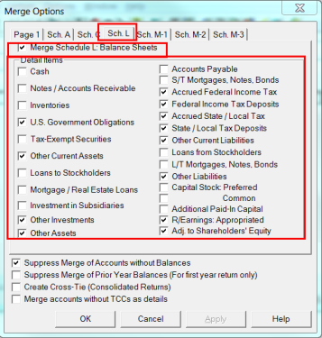 This option is intended for other than first-year users. - Suppress prior year balances only Existing Organizer data (including manual entry, locked data, and overrides) remains the same. If a description has changed for a detailed item that has previously been merged, a new line item will be added in the Organizer and the original line item (old description) will remain as a separate entry. The merge operation transfers all accounts to the Organizer.