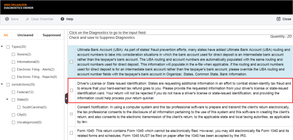 For instance, the system reminds you that the taxpayer’s driver’s license number or State Identification Number needs to be entered. Click the Diagnostics field for a direct link to the input field. You can then enter the correct data. This automatically clears the diagnostic. Use the Previous History icon to return to the Diagnostics screen.