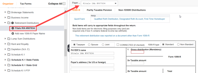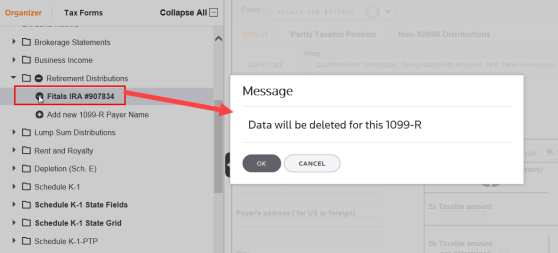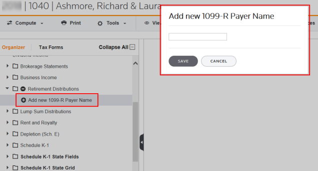 You can add items to some folders. In this example, select Retirement Distributions and select Add New 1099-R Payer Name. Enter a description for the new item in the field, and click Save.