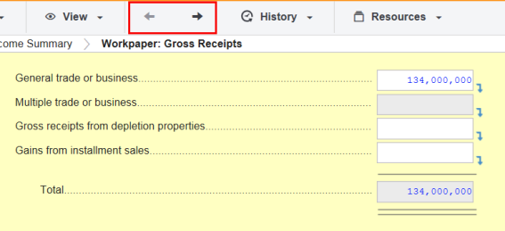 When you use hyperlinks to access other areas of the return, you can easily return to the screen you were on by using the Previous in History, History, or Next in History icons on the toolbar. Each of these navigation methods is also available through the View menu.