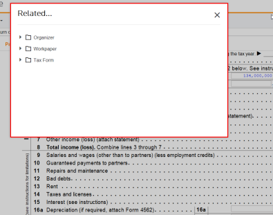 Select Related... from the menu to see the Related items dialog box shown below. You can access the Organizer, Workpaper, Tax Form, or Tax Review forms related to this field by clicking the item.
