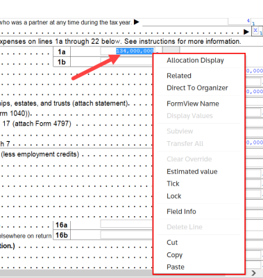Use your mouse to access hyperlinks that show related screens. Double-clicking a field drills down to a lower level screen. Right-clicking a field displays a hyperlink menu. A double-click is also known as a drill-down hyperlink. This link takes you directly to the source of that entry. The source can be another form, schedule, workpaper, or Organizer screen.