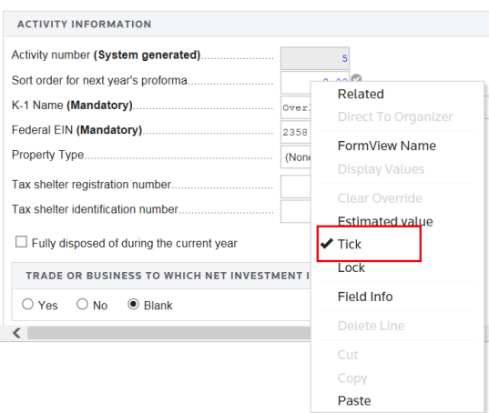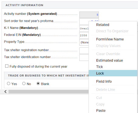 When you right-click a locked field, both Tick and Lock will show as selected. Turn Lock off deselects both marks.