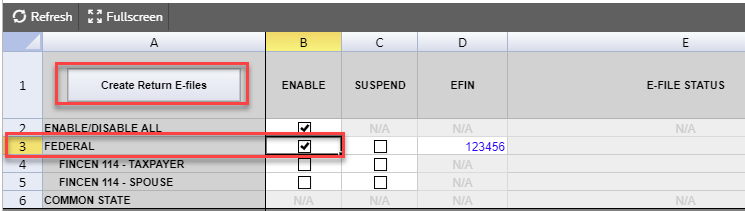 On the Enable/Create screen/Return tab, make sure that Federal is selected in Column B, and select the Create Return E-files button.