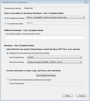 For PDF attachments of other states’ returns for Credit for Taxes Paid to Other States, select both:- SchOSC from the Form/Schedule Name drop-down list