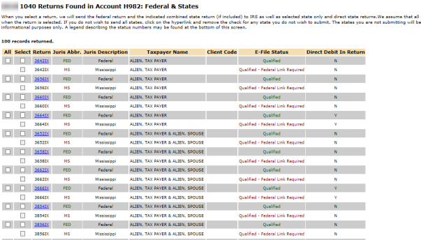 - You can select which returns you send to the IRS by checking the box in the Select column.