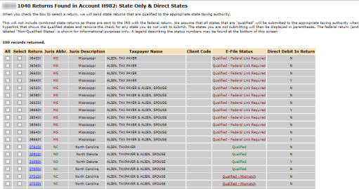 - You will see a list of locators where there are one or more state returns ready to be sent without the federal return.