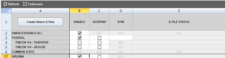 Enable Selecting this check box is mandatory to create an e-file, to generate reject diagnostics, and to identify validation issues. By default, this check box is selected for each jurisdiction.
