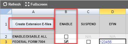 - On the Organizer tab, select E-file > Enable/Create. Select the Extension tab.