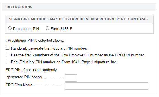 - Select the signature method: Practitioner PIN or Form 8453-F. You can overwrite this selection on a return-by-return basis.