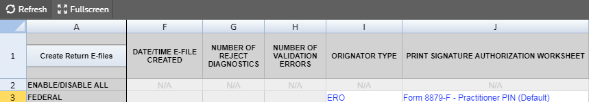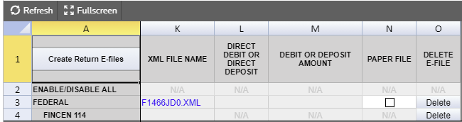 Create Return E-files Clicking this button creates the e-file and identifies if there are any reject diagnostics or validation errors. The e-file status and XML information is then displayed.