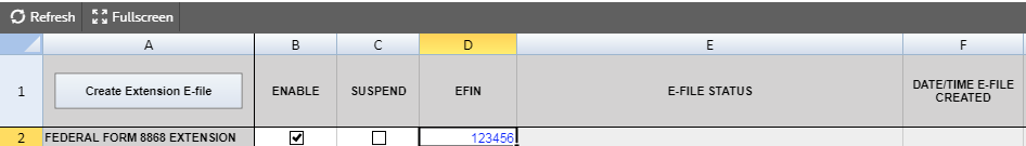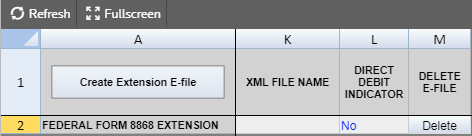 Create Extension E-files Clicking this button creates the e-file and identifies if there are any reject diagnostics or validation errors. The e-file status and XML information is then displayed.