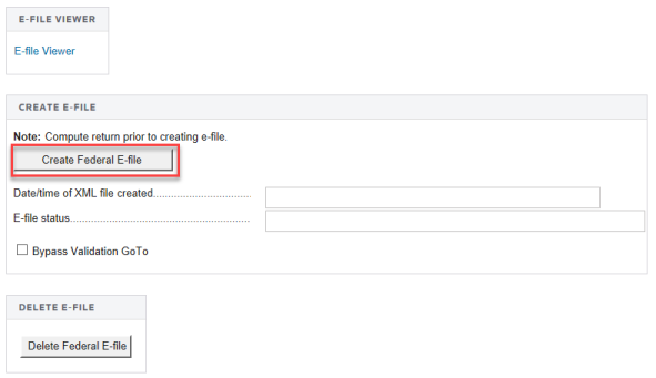 On the Create E-file screen, select the Create Federal E-file button.