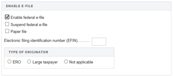 - From within a top consolidation return in the Organizer, select Federal E-file > Enable. Verify that the Enable federal e-file check box is selected.