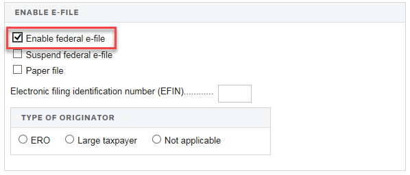 - In the Organizer of the top consolidation locator, select Federal E-file > Enable. Select the Enable federal E-file check box, shown below.