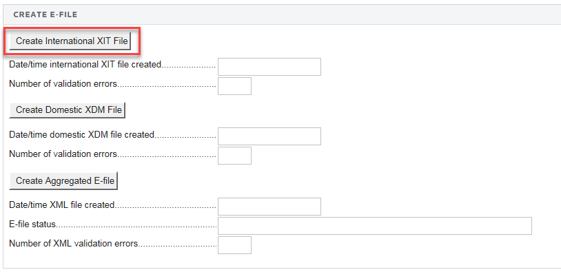 - To generate the *.xit file, (1) click the Create International XIT File button. The reports outcome appears in the (2) Create E-file section, including validation errors, if any, with a date and time stamp.