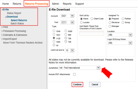 Including a return in the international e-file is based on a number of settings as follows: