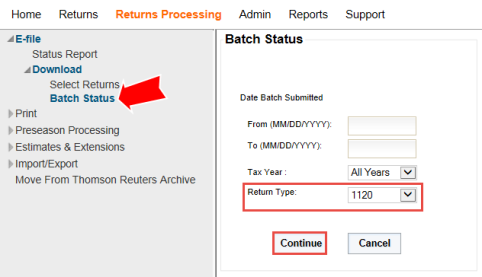 - View the progress of your download on the Batch Status screen. Select 1120 Return as the Download Type in the drop-down list, and then click Continue.