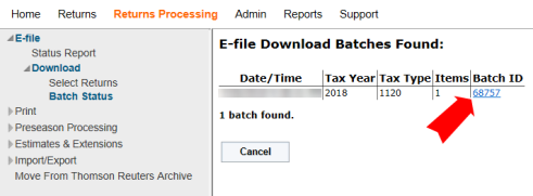 - Click the Return Processing > E-file > Download > Batch Status item on the menu.