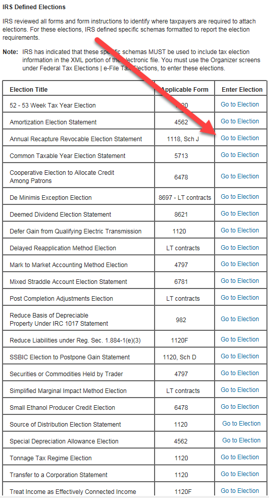 The E-file Tax Elections (Organizer > Federal Tax Elections > e-File Tax Elections > e-File Tax Elections) screens are used for entering IRS Defined Elections. These elections are included in the XML file using the specific IRS-defined schemas.
