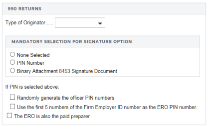- Select the default signature method: None Selected, PIN, or Binary Attachment 8453 Signature Document. You may override this default on a return-by-return basis.