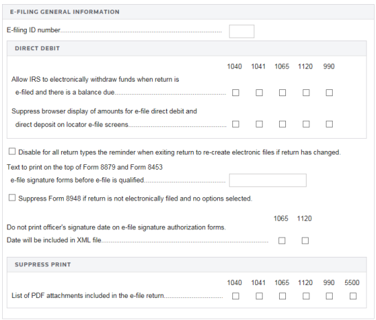 - Select the option, if desired, to suppress print of the list of PDF attachments included in the e-file return. You may select this for one, more than one, or all of the listed tax return types.
