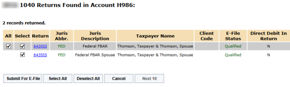 1040 Returns: If separate FBARs are prepared for taxpayer and spouse, and both FBARs are qualified, each FBAR is displayed in the search results. Each FBAR is displayed with identical locator numbers and taxpayer names.