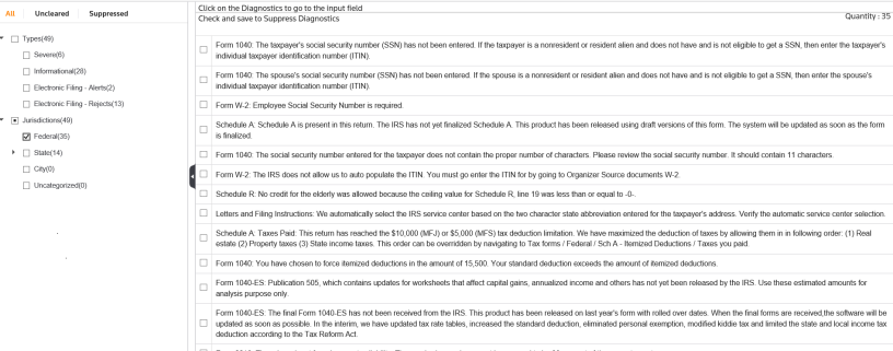 1040 Returns: Within a 1040 return, separate FBARs can be prepared for taxpayer and spouse. If separate FBARs are prepared, separate validation files should be generated. But note that the validation errors shown under View > Diagnostics only display errors from the last generated validation file. Therefore, generating a validation file and correcting errors for one FBAR before validating the second FBAR might be more efficient.