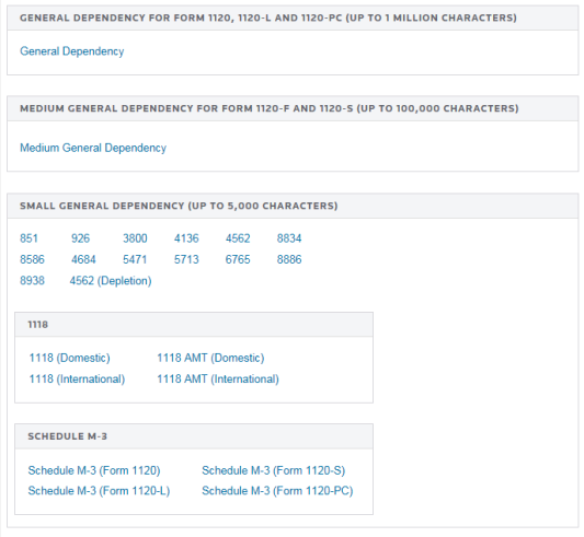 General Dependency (Medium) Available for Forms 1120S and 1120-F, this is attached at the return level and allows for an explanation of up to 100,000 characters.