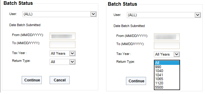 - The Batch Status options will default to your login ID, today’s date, All Years, and All Return types. Use the drop-down lists to refine your choices: