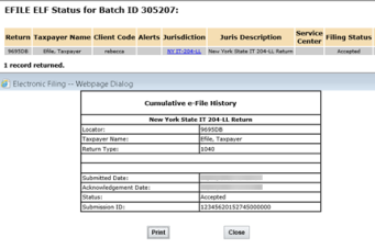 Click the filing status to display a printable summary of the e-file, including the following information: