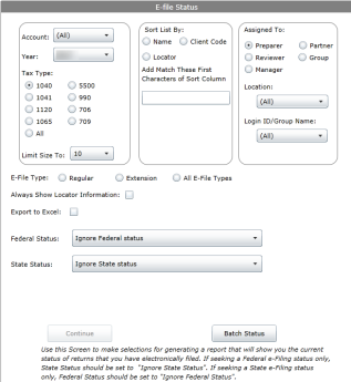 - Go to Reports > E-file Status Report to enter your search criteria and options.