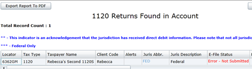 This option is for both federal and state jurisdictions for both returns and extensions (All E-file Types). This option will list the submitted returns that, for any reason, cannot finish the submission process.