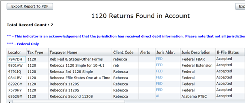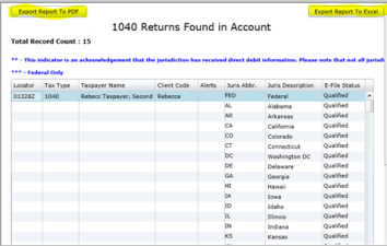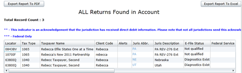 - All Statuses (excluding Ready to Send): This option will show you all of the returns that have been submitted for e-file and all the current statuses for each jurisdiction within each submitted return.