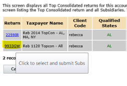 - All check boxes displayed beside Alabama (or New York) consolidated returns are grayed out and are not available to Submit For E-File. A message will pop up reminding you to submit this return with the entire consolidated group. Click the hyperlink on the subsidiary return ID.