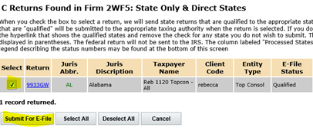 - From the Returns screen: All the qualified states will display and be available to submit for e-file except for Alabama and New York. Check the Select option next to the states and click the Submit For E-File button at the bottom of the screen. All states other than the two mandatory states can be submitted to their respective jurisdictions from the first Returns screen.