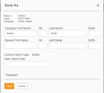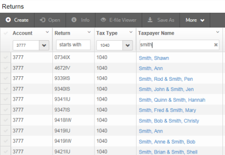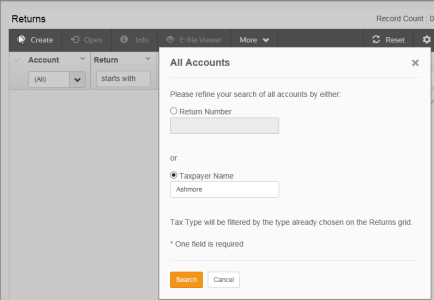 - Select the account and return type (1040) from the drop-down lists. If you select All for the account, a dialog box will appear for you to enter either the return number or the taxpayer name. You must enter one of these. Then click Search.