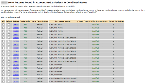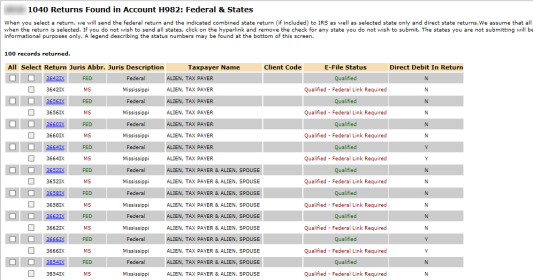 - You can select which returns you send to the IRS by checking the box in the Select column.