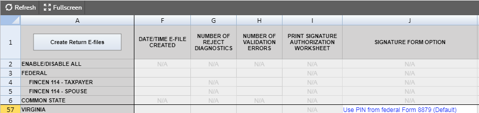 Enable Selecting this check box is mandatory to create an e-file, to generate reject diagnostics, and to identify validation issues. By default, this check box is selected for each jurisdiction.