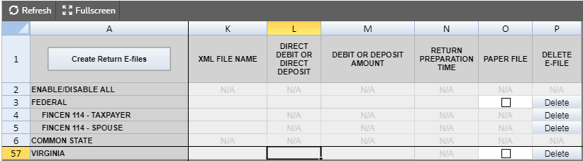 Delete E-file The Delete button deletes the existing XML file for that jurisdiction. The Enable check box must remain checked before you click the Delete button. The E-file Status changes to indicate that the XML file has been deleted.