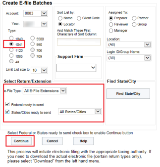 - Select whether the returns are Federal Ready to Send and/or States/Cities ready to send: All States/Cities.