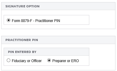 - Select the type of PIN signature: Form 8879F - Practitioner PIN.