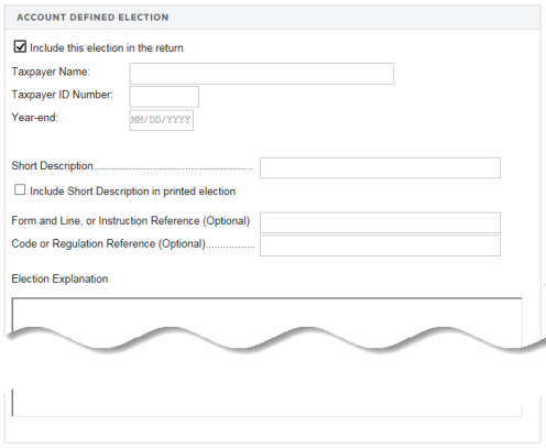You have the ability to set up your own elections in the Tax Defaults. These elections are displayed within Organizer > Federal Tax Elections > Account Defined Elections when you open your return. You can then select those elections that might apply to this return. Modifications can be made to these elections, but Account Defined elections cannot be added within the return.
