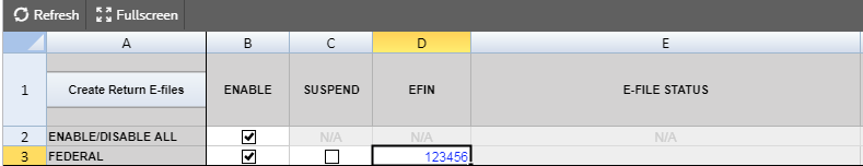 Create Return E-files Clicking this button creates the e-file and identifies if there are any reject diagnostics or validation errors. The e-file status and XML information is then displayed.
