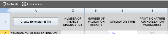 Create Extension E-files Clicking this button creates the e-file and identifies if there are any reject diagnostics or validation errors. The e-file status and XML information is then displayed.